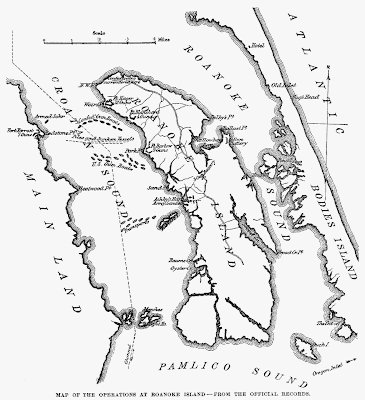 | Mapa dos Outer Banks, com a ilha de Roanoke (1585) |